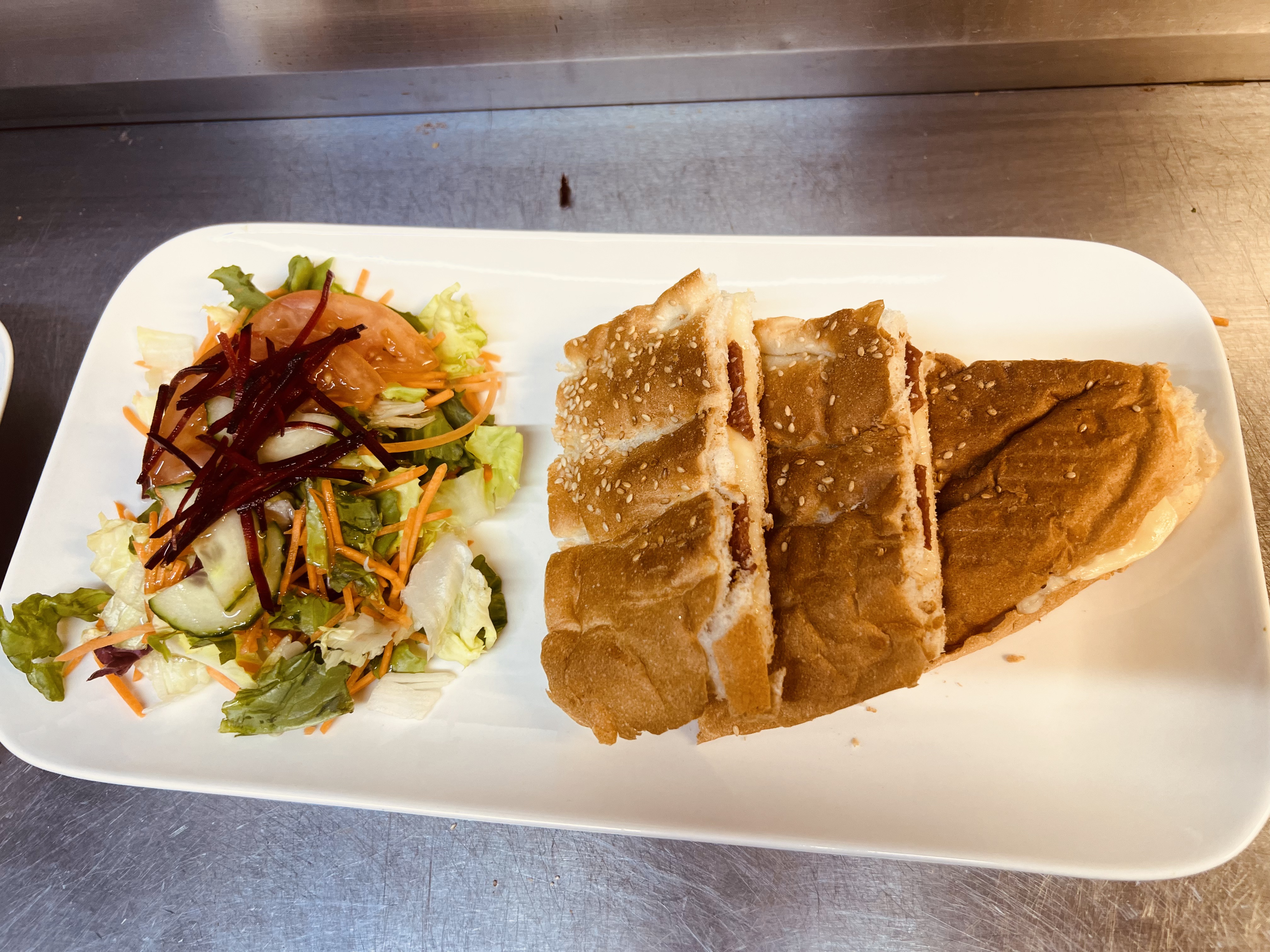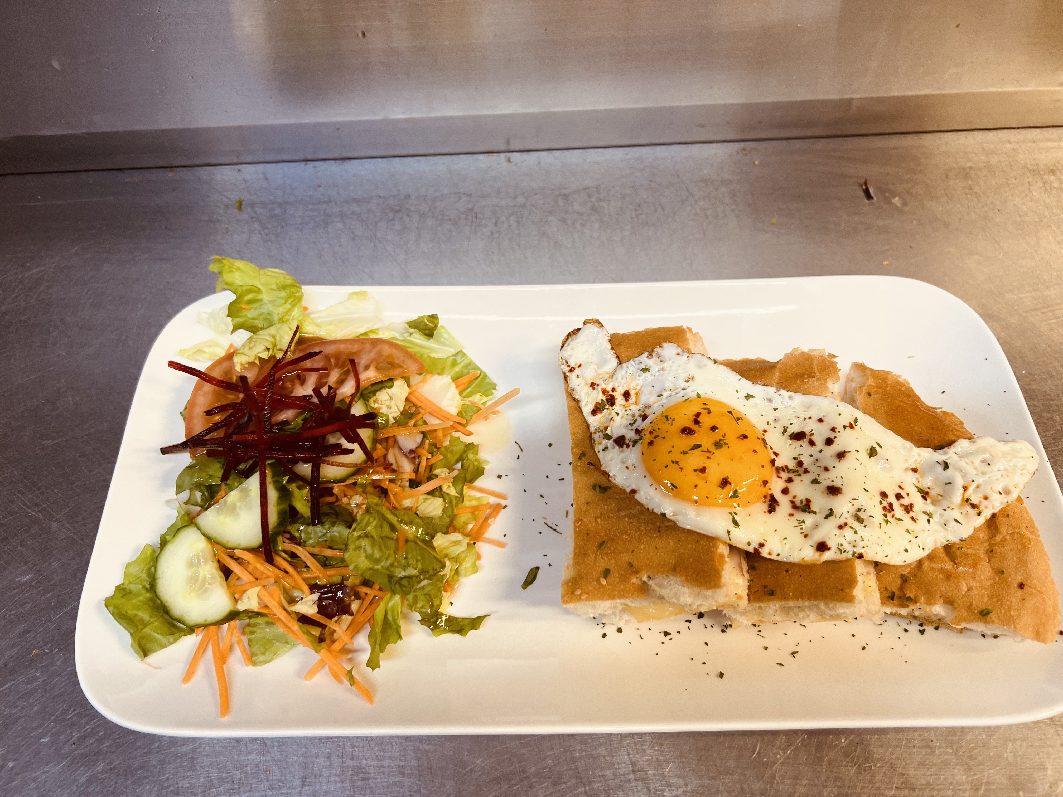 Toasted Turkish bread filled with cheese and ham, served with salad. Madame topped with a softly fried egg +1€.