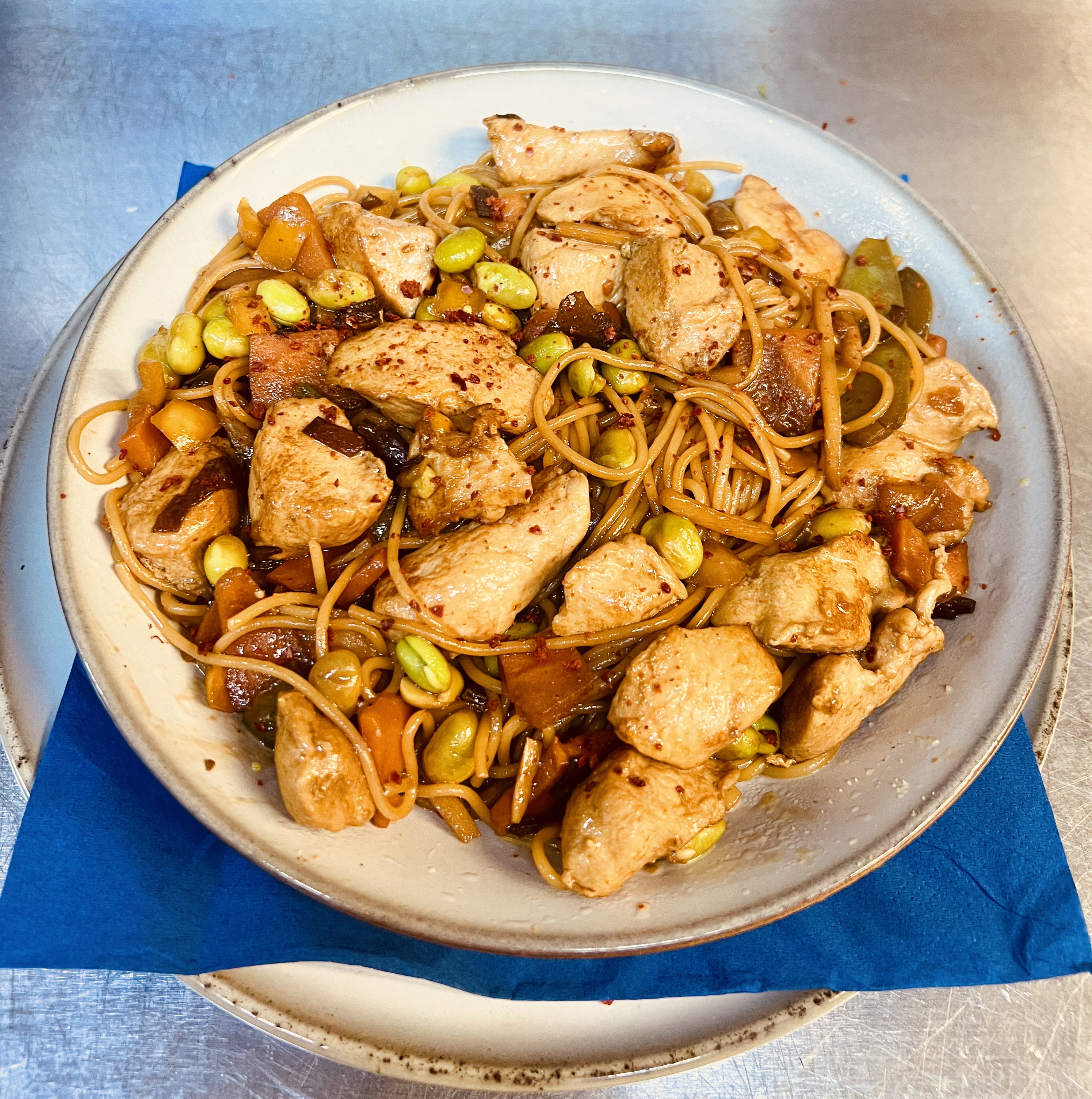 Stir-fried chicken and vegetables in oriental wok sauce, mixed with capellini. Served with rice and fresh salad.