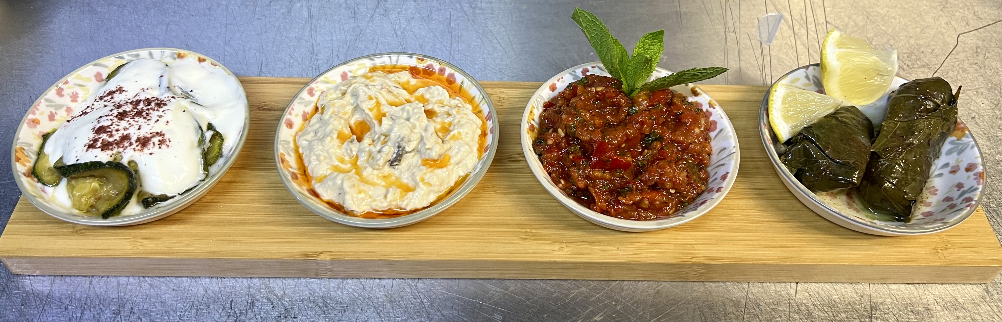 Selection of four refined cold mezzes: • Ezme – spicy Turkish tapenade • Havuç Haydari – creamy yoghurt dip with carrot • Hummus – smooth chickpea cream • Baba Ghanoush – grilled aubergine dip