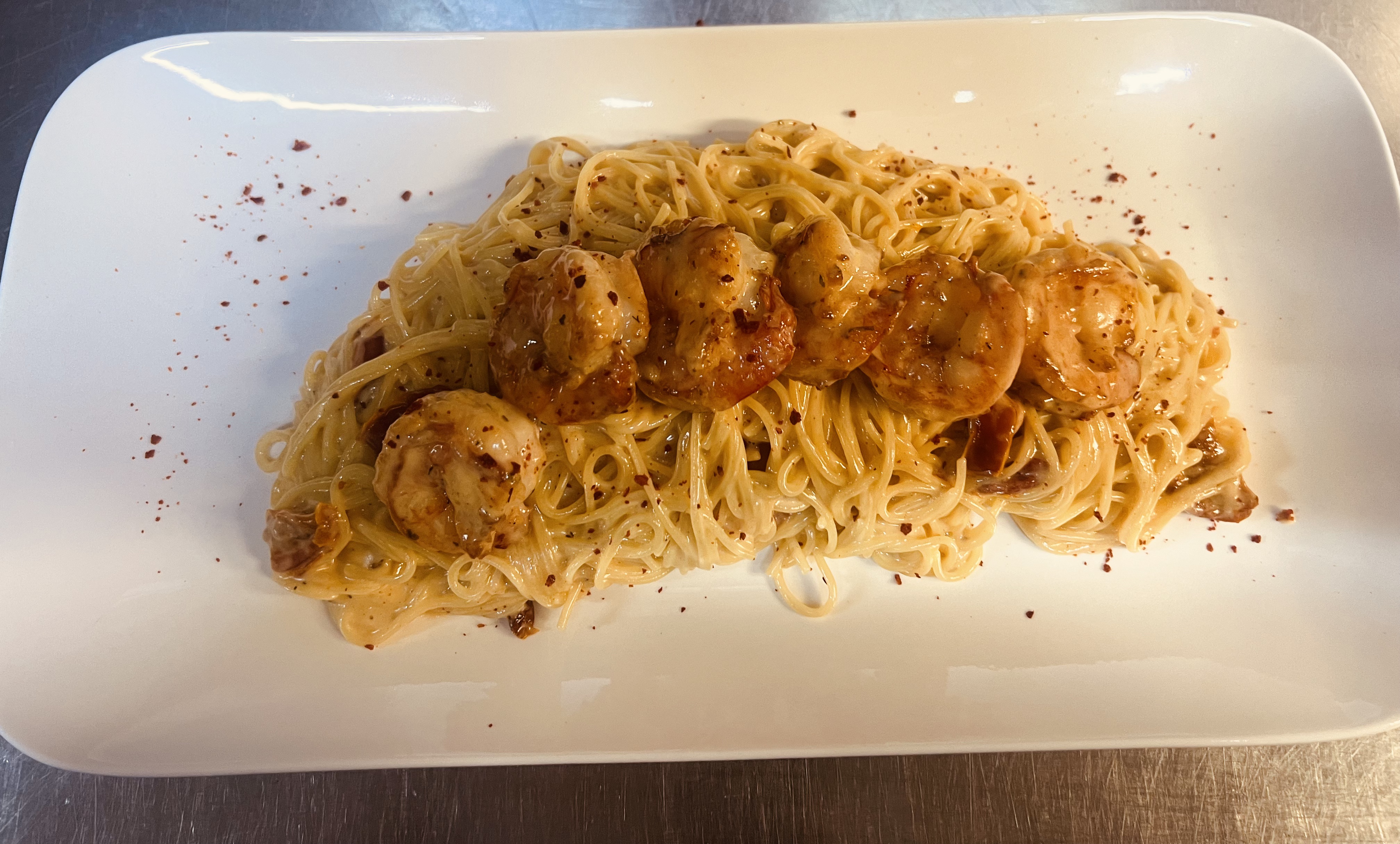Fijne capellini met gebakken scampi, zongedroogde tomaten en een romige saus met een zachte pittige toets. Elegant en vol van smaak.