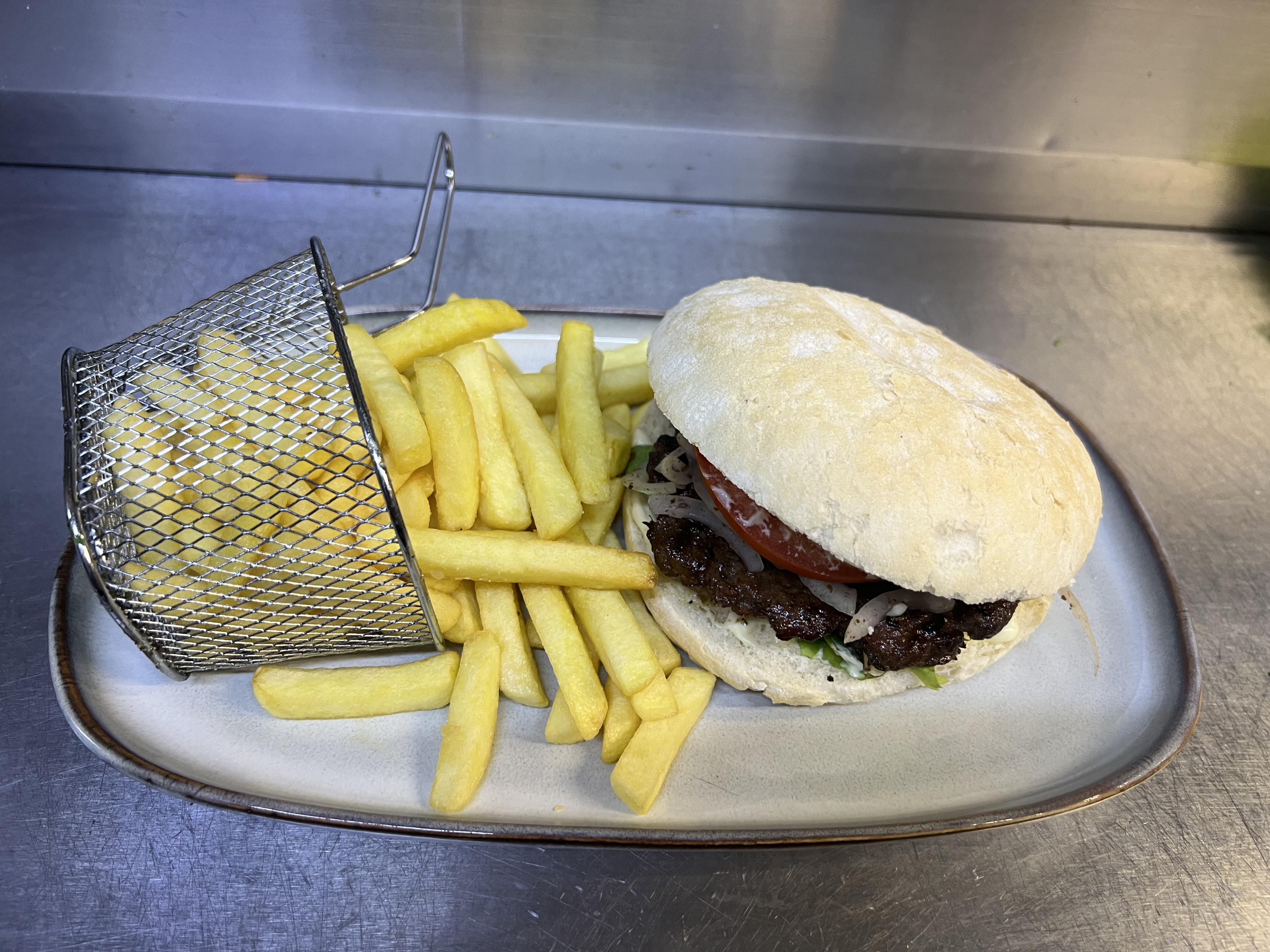 Hamburgerbrood gevuld met gekruide runderköfte, frisse sla, tomaat, ui en een vleugje sumak. Geserveerd met frietjes.
