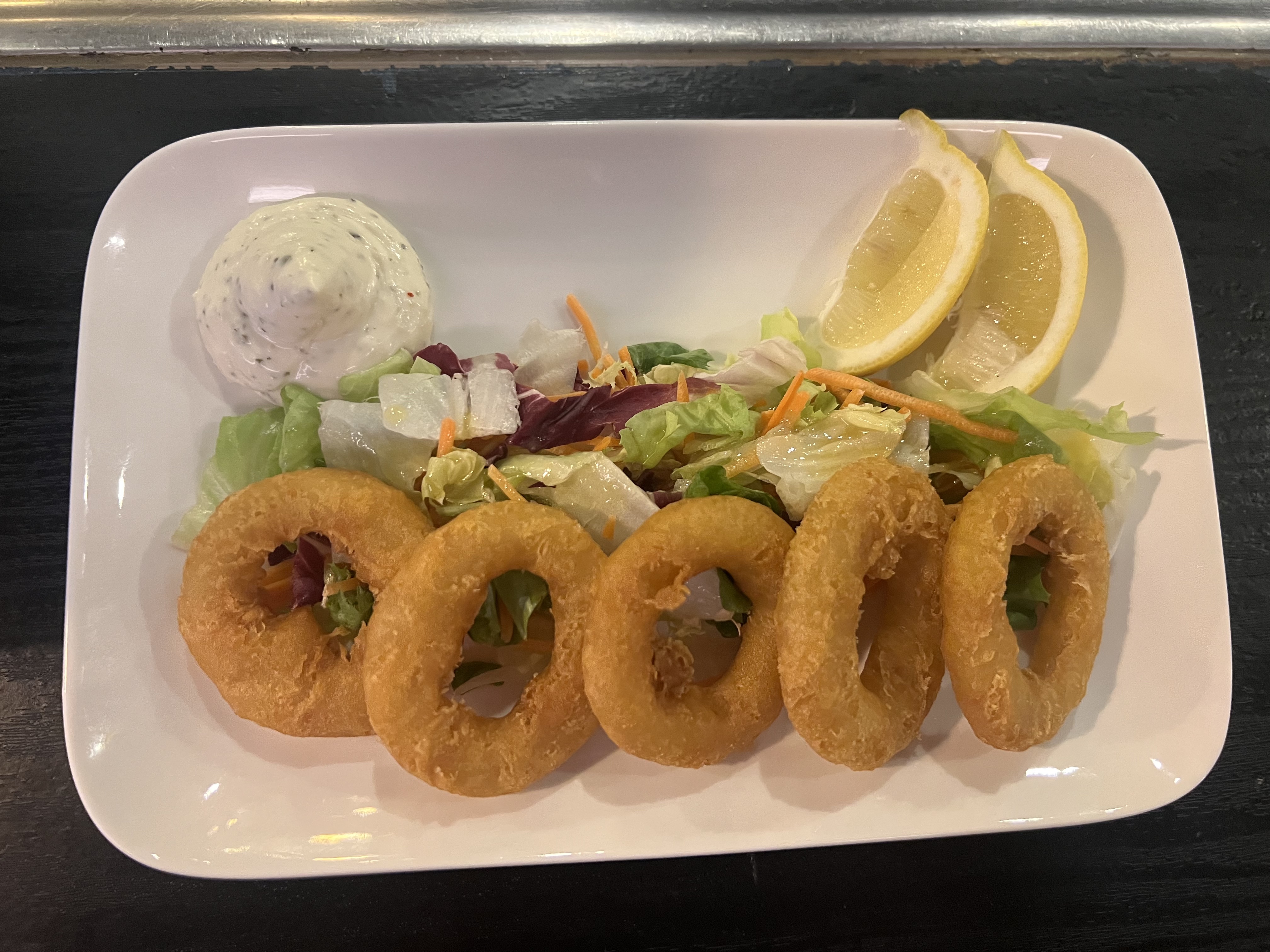 Krokante calamaresringen met een frisse munt-yoghurtdip en partje citroen.