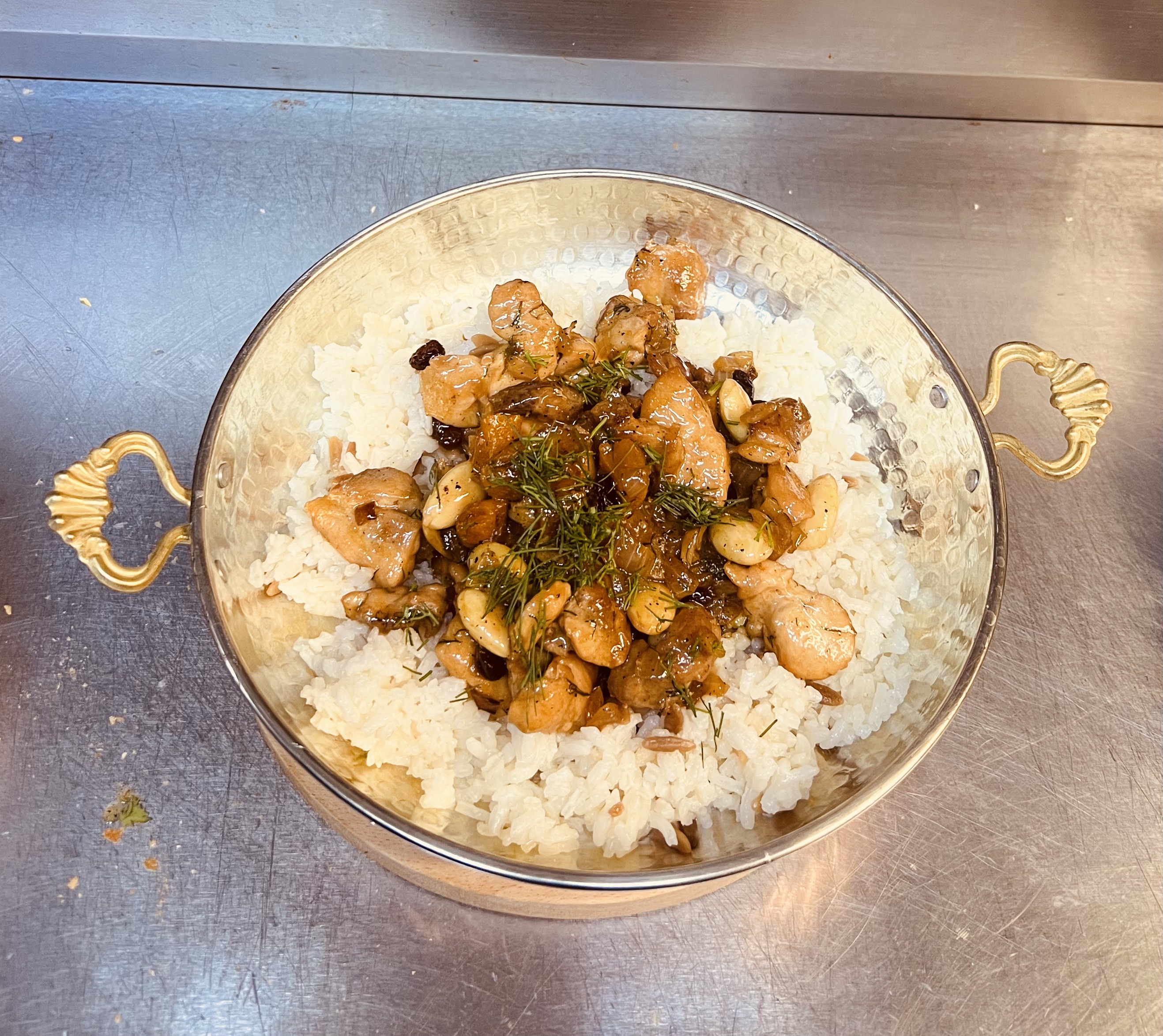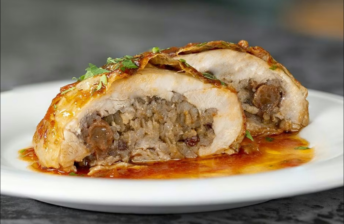 Een klassieker uit de Ottomaanse hofkeuken. Malse kipfilet gevuld met rijst, ui en rozijnen, langzaam gegaard in de oven. Geserveerd met een lichte tomatensaus en vers brood.