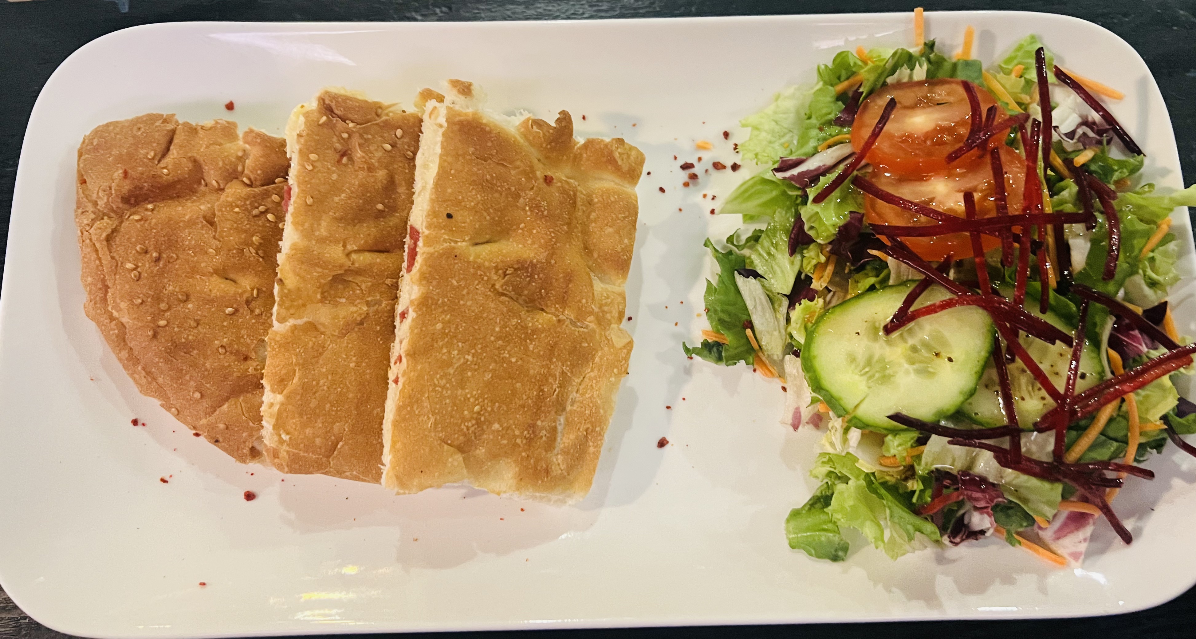 Turks brood gevuld met kaas en hesp met salade. MADAME afgewerkt met een zacht gebakken eitje.