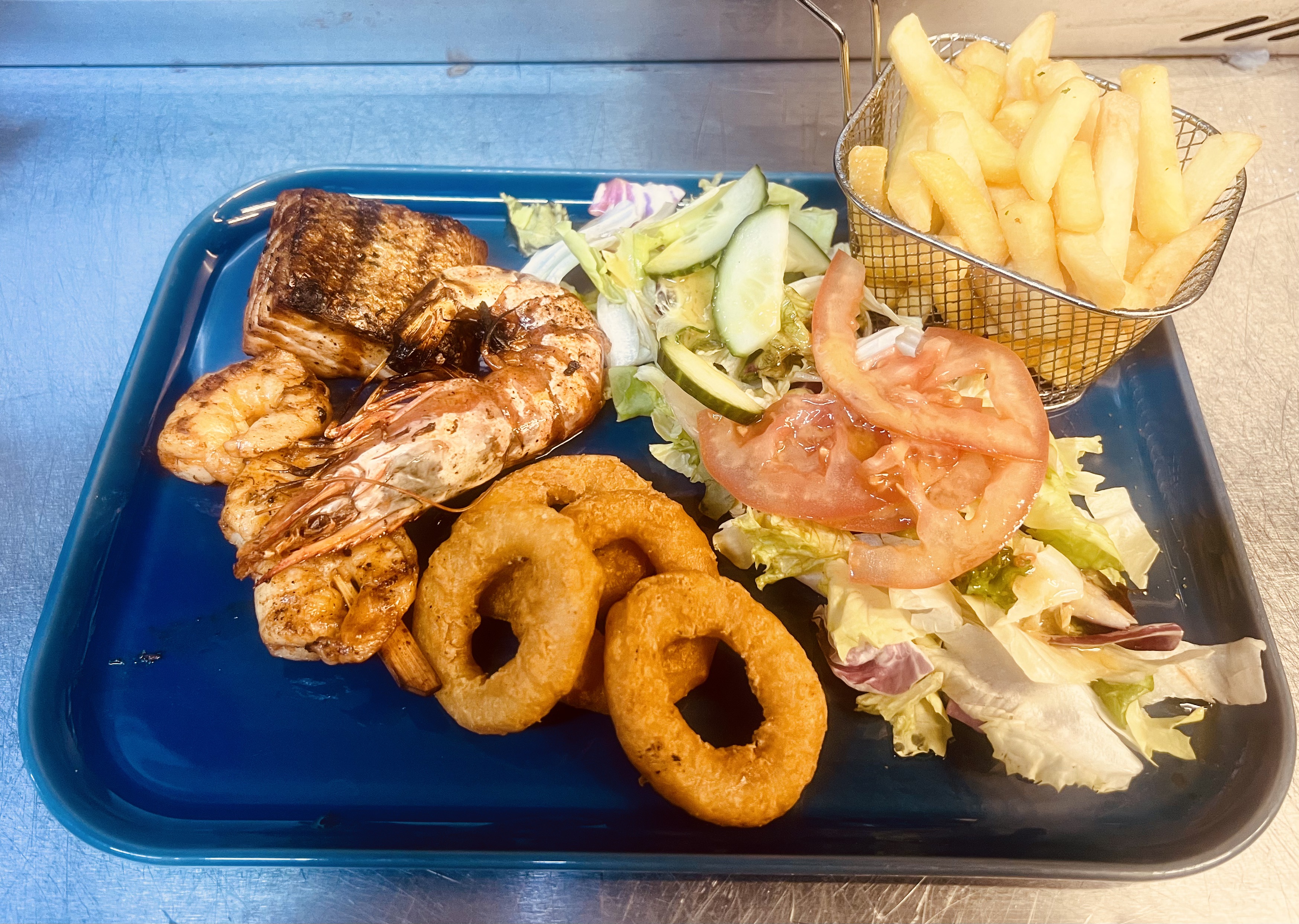Grilled scampi skewer with gamba, salmon and calamari. Served with fries and salad.