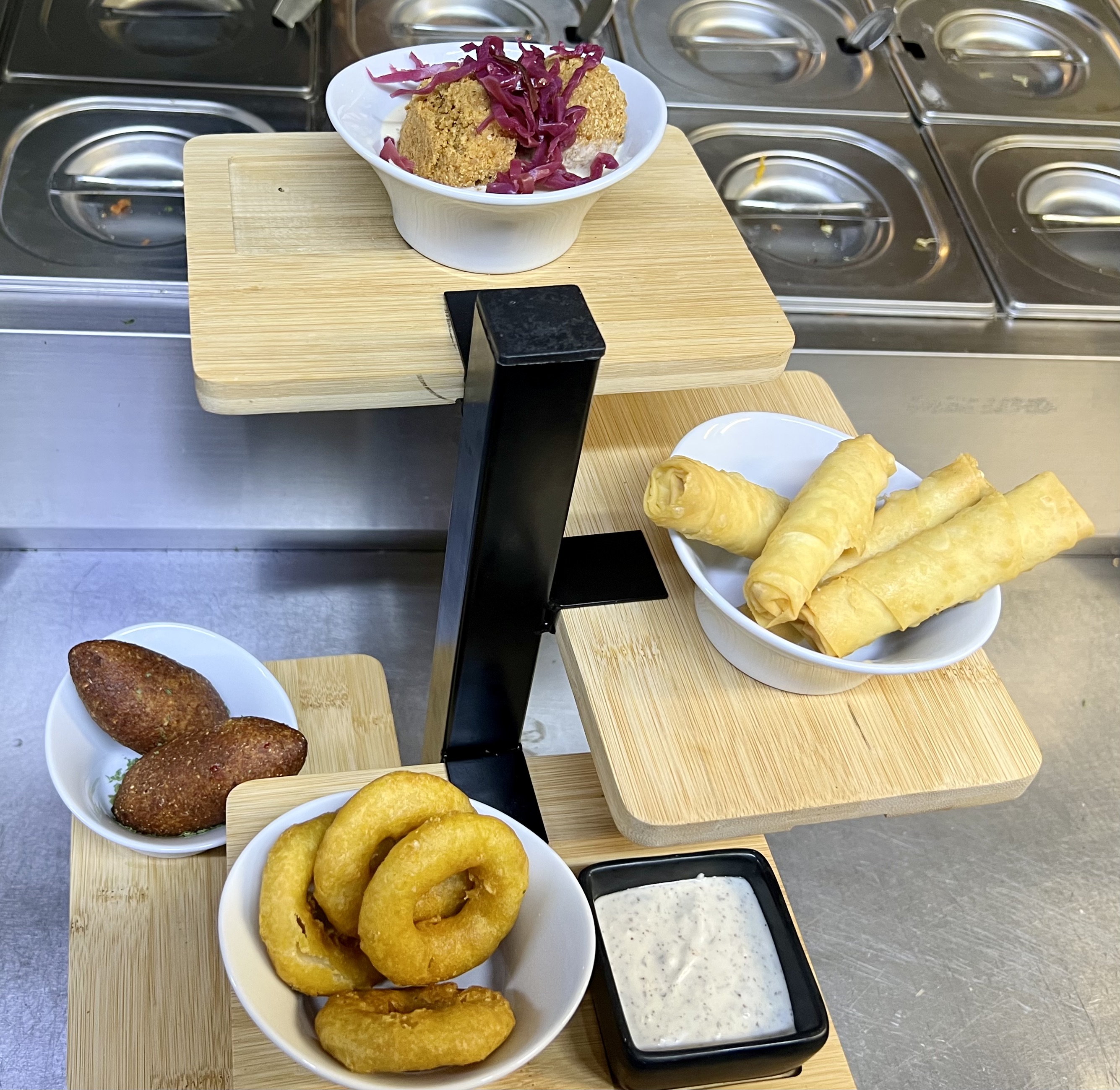 Een smaakvolle selectie van warme mezzes: • Sigara Böreği – krokant deegrolletje met feta en kruiden • İçli Köfte – gevuld met fijn gekruid gehakt • Falafel – kruidig en goudbruin, geserveerd op tahin- en yoghurtsaus • Mücver – luchtige courgettekoekjes met romige knoflookyoghurt.