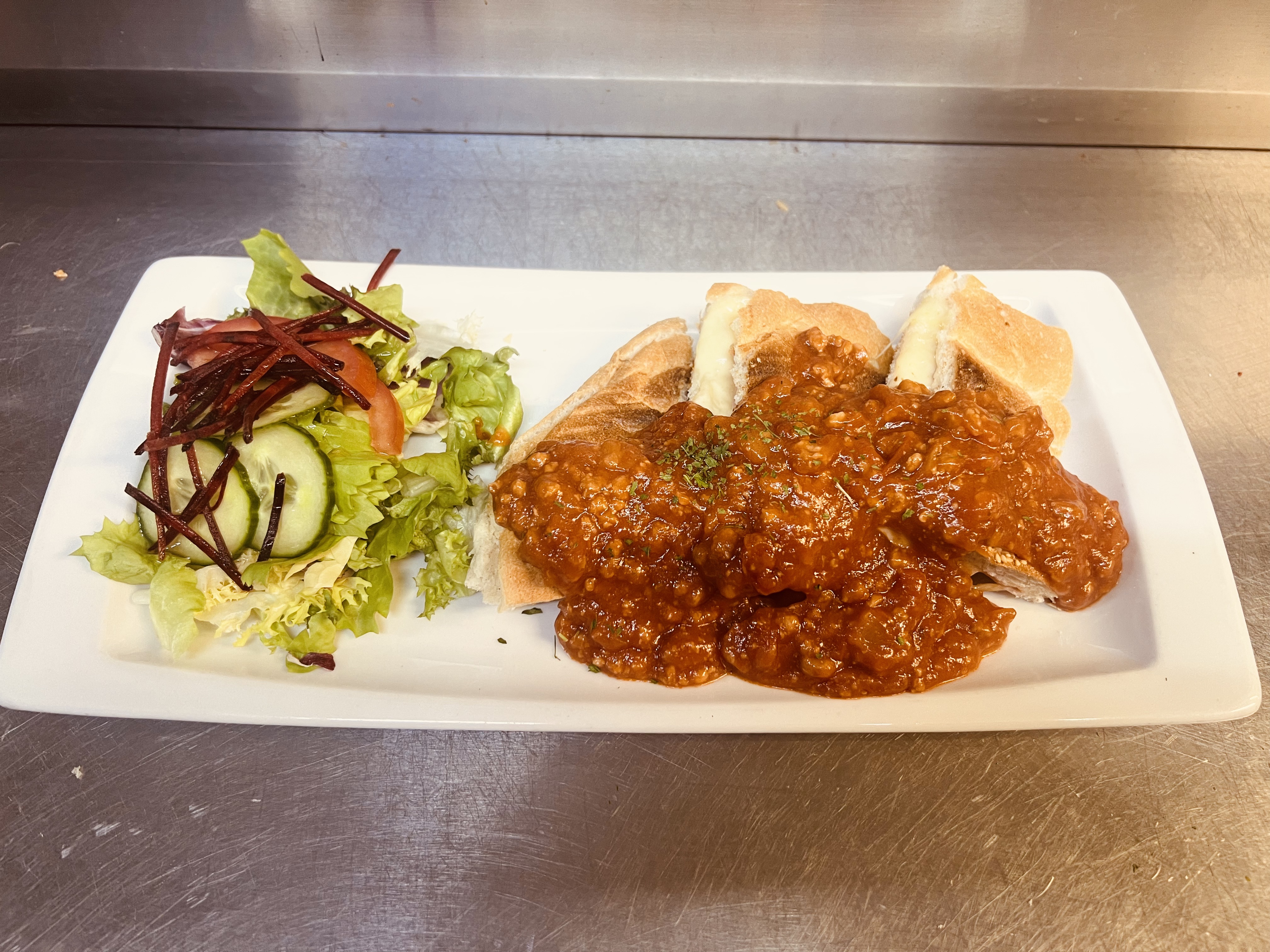 Geroosterd Turks brood met kaas, huisgemaakte bolognesesaus en gegrilde groenten. Rijk en vol smaak.