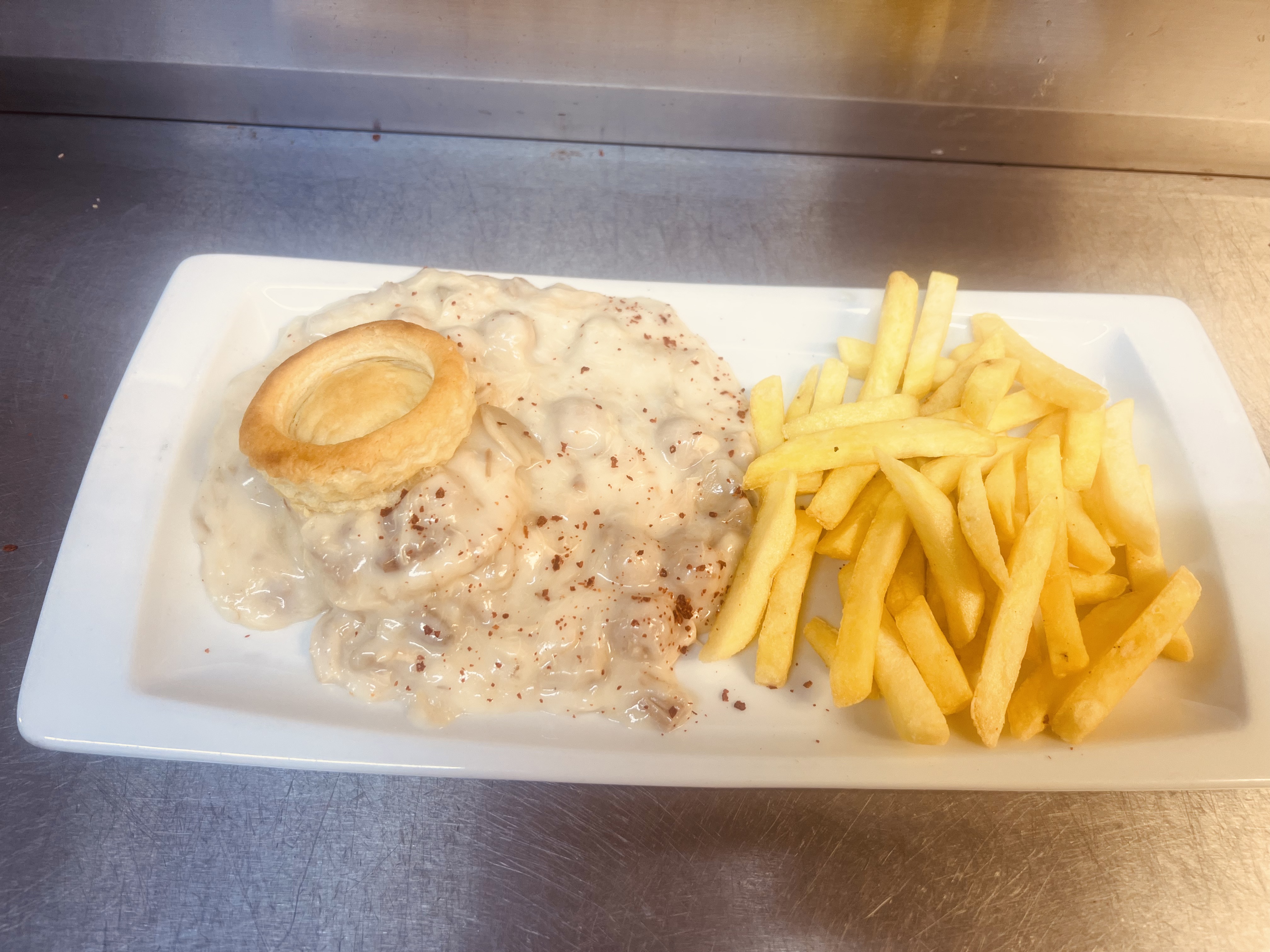 Romige kippenragout met balletjes en champignons, geserveerd met frietjes.