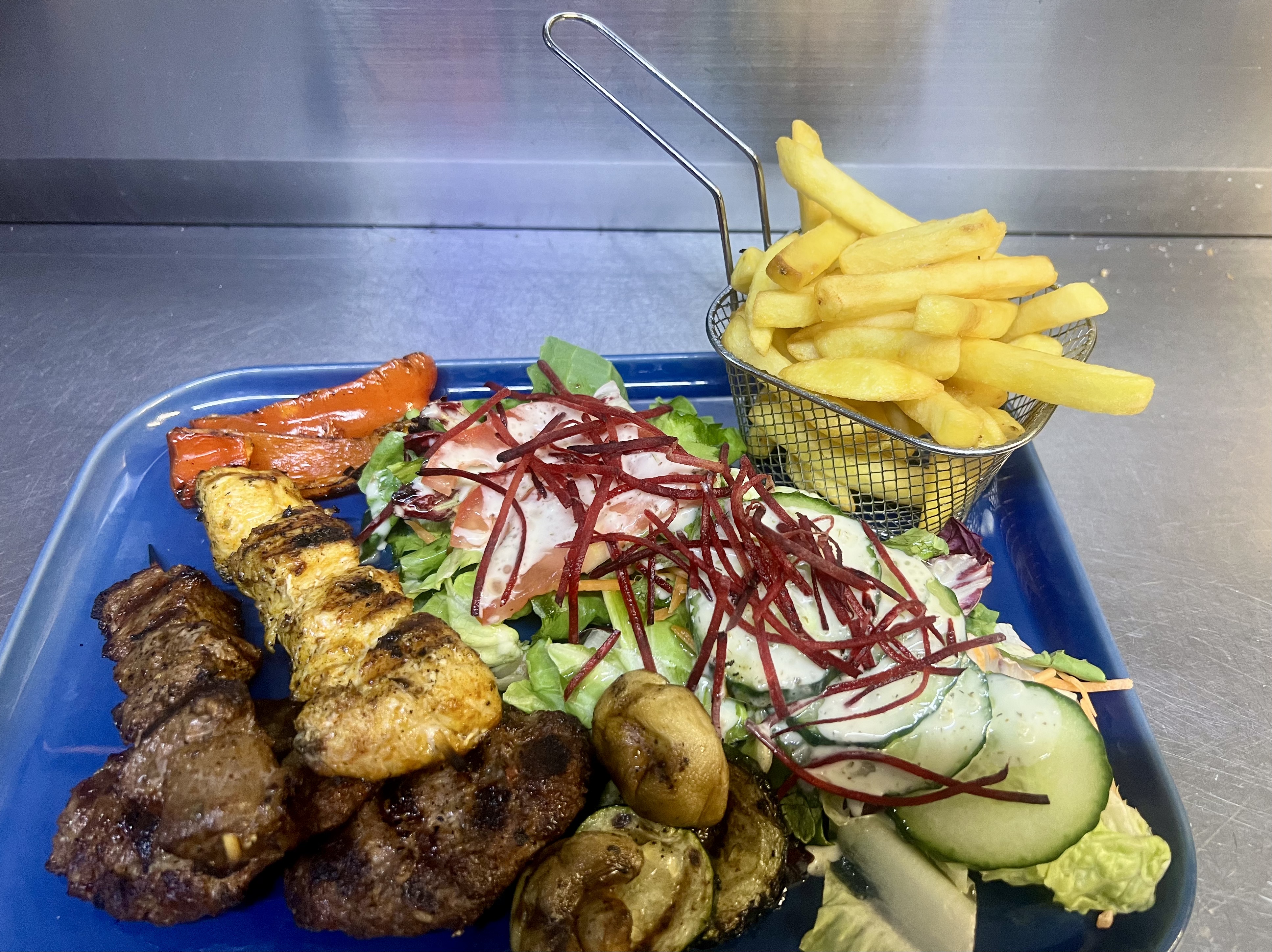 Combination of chicken satay, beef satay, lamb satay and köfte. Grilled and full of flavour. Served with fries and fresh salad.