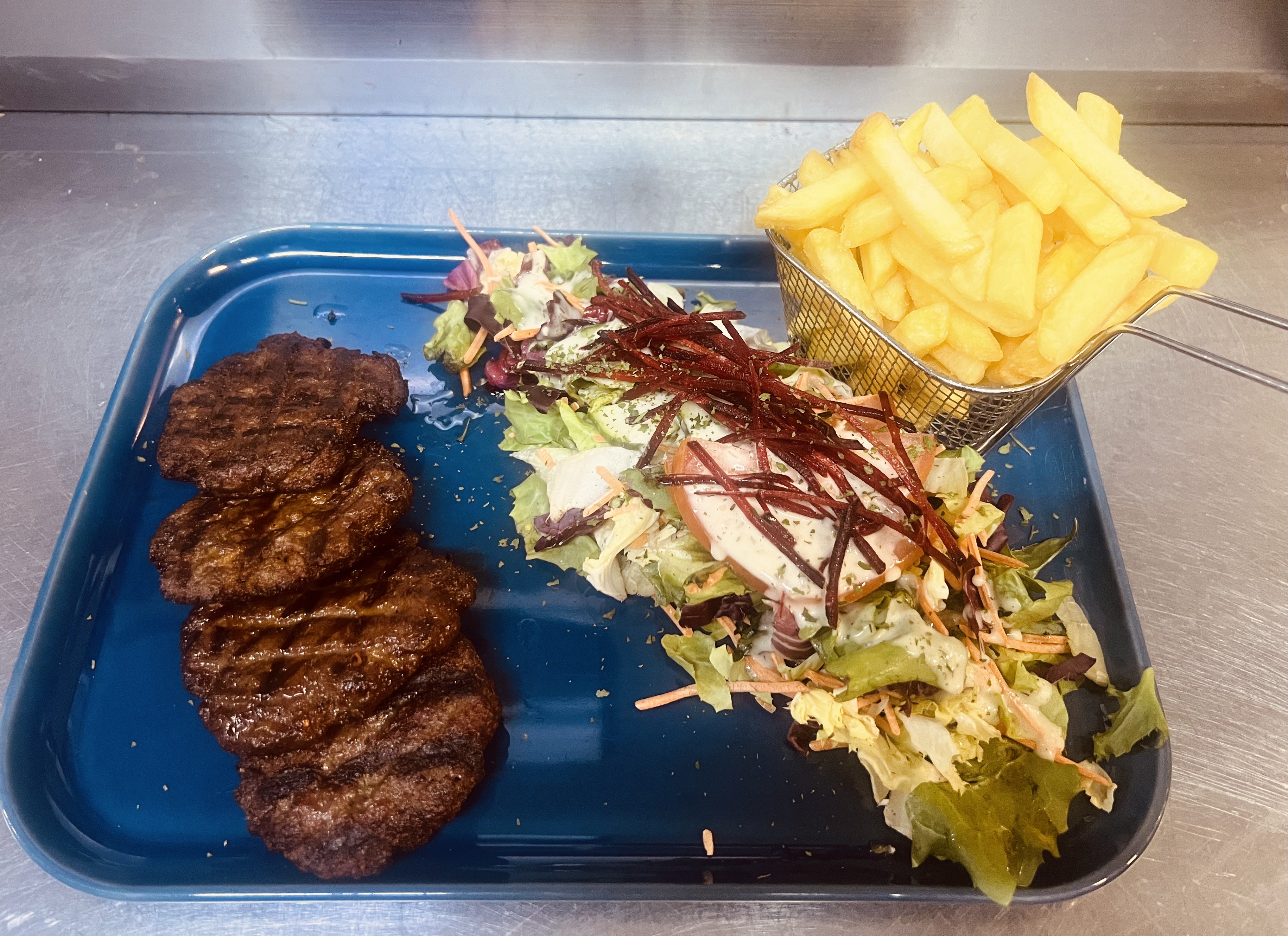 Huisgemaakte, gekruide rundergehaktballetjes, gegrild tot ze heerlijk sappig zijn. Geserveerd met frietjes en frisse salade. Een smaakvolle klassieker met oosterse kruiden, perfect voor elk moment van de dag.
